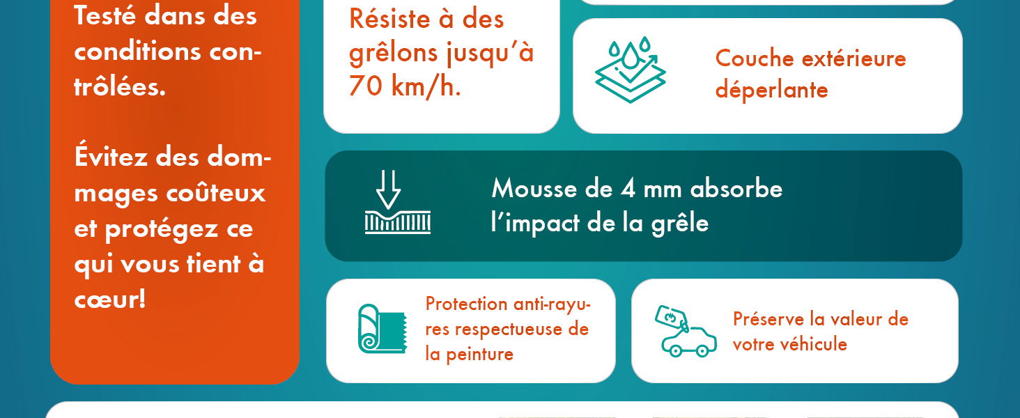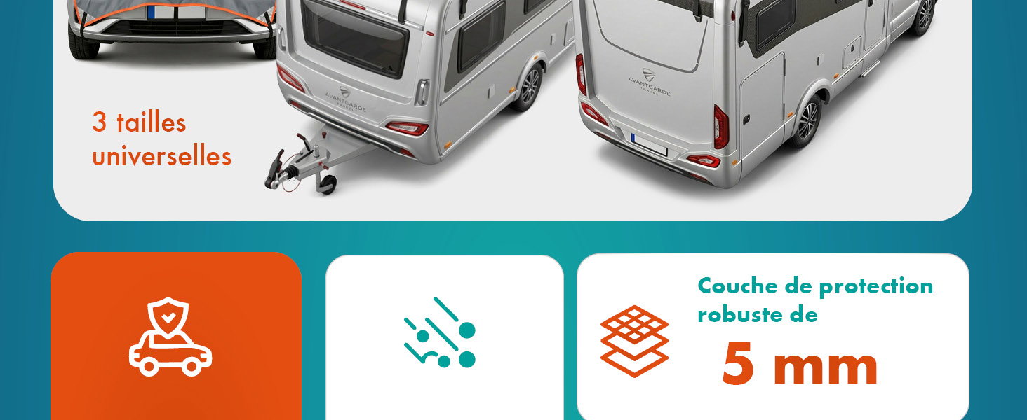 Des nuages épais et menaçants s'amoncellent et votre véhicule est garé dehors. Avec la bâche anti-grêle Universal, vous pouvez regarder la grêle tomber sans crainte. Votre camping-car ou caravane est protégé : Les grêlons rebondissent sur la bâche bien rembourrée et les vitres, le toit et le capot restent intacts. Vous pouvez ainsi profiter du moment en toute tranquillité, sans avoir à vous soucier de réparations coûteuses.