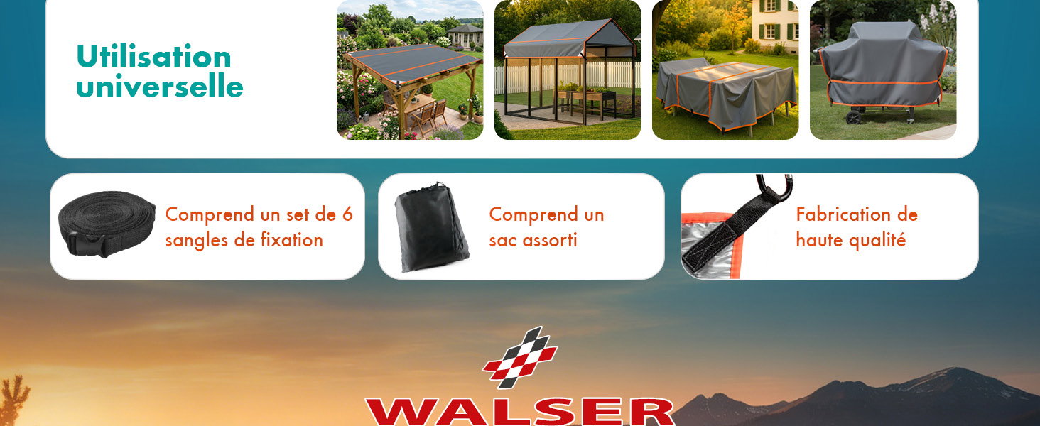 Grâce à ses 10 points de fixation, ses 6 sangles de 6 m avec fermeture à ressort et son aide au montage, la bâche anti-grêle Universal se fixe facilement. Elle n'est pas seulement idéale pour les camping-cars et les caravanes, mais protège également de manière fiable les meubles de jardin, les serres, les plateaux de table ou les barbecues. En cas de fortes variations de température, de la condensation peut se former sous la bâche - il est donc important de l'enlever et de l'aérer régulièrement afin de préserver durablement la peinture et les matériaux. Flexible, universelle et fiable - la solution idéale pour les véhicules et objets de valeur.
