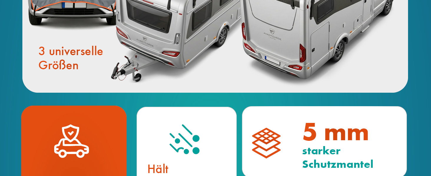 Dicke, bedrohliche Wolken ziehen auf, und Ihr Fahrzeug steht draußen. Mit der Hagelschutzplane Universal können Sie unbesorgt zusehen, wie der Hagel niedergeht. Ihr Wohnmobil oder Wohnwagen ist geschützt: Hagelkörner prallen an der gut gepolsterten Plane ab, und Scheiben, Dach sowie Motorhaube bleiben unversehrt. So können Sie den Moment beruhigt genießen, ohne sich um teure Reparaturen sorgen zu müssen.